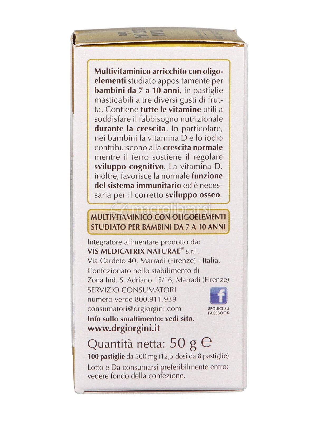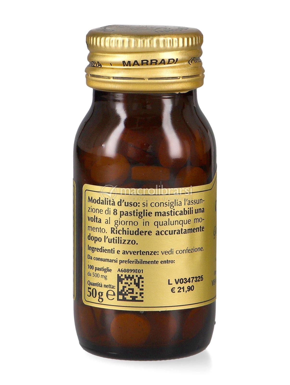 | Disclaimer | Non superare la dose giornaliera consigliata. Gli integratori alimentari non vanno intesi come sostituti di una dieta variata ed equilibrata. Tenere fuori dalla portata dei bambini al di sotto dei tre anni. Non utilizzare in gravidanza e nei bambini o comunque per periodi prolungati senza sentire il parere del medico. Conservare in luogo asciutto e lontano da fonti di calore. Richiudere la confezione dopo l'uso. Macrolibrarsi ricorda l'importanza di seguire uno stile di vita sano e un'alimentazione variata ed equilibrata. |