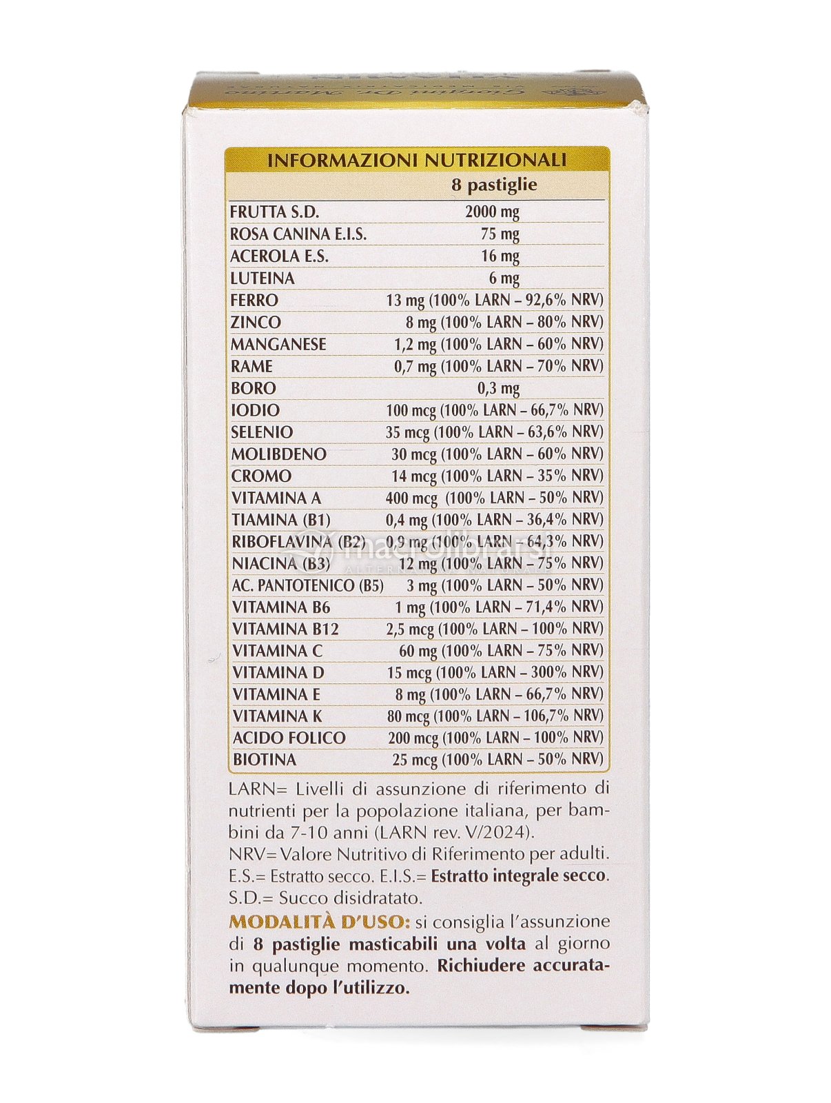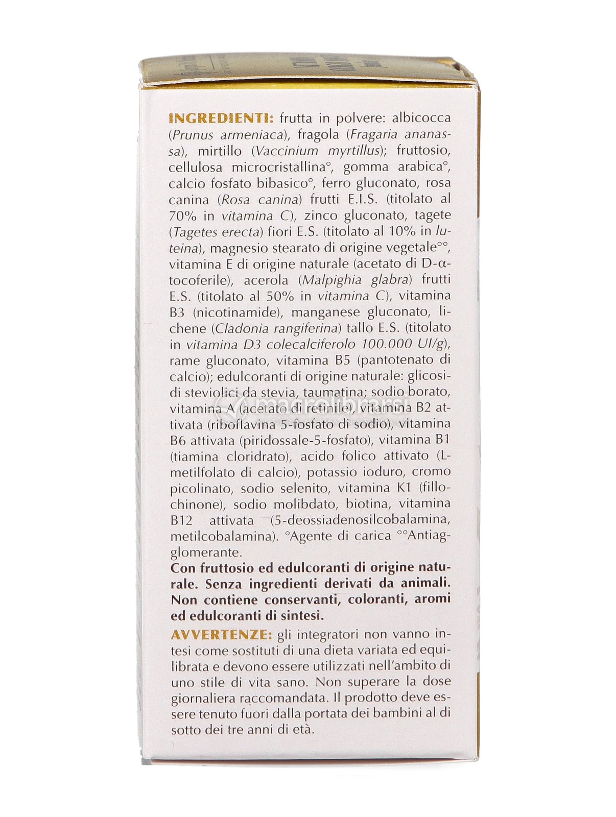 | Avvertenze | Gli integratori non vanno intesi come sostituti di una dieta variata ed equilibrata e devono essere utilizzati nell’ambito di uno stile di vita sano. Non superare la dose giornaliera raccomandata. Il prodotto deve essere tenuto fuori dalla portata dei bambini al di sotto dei tre anni di età. |