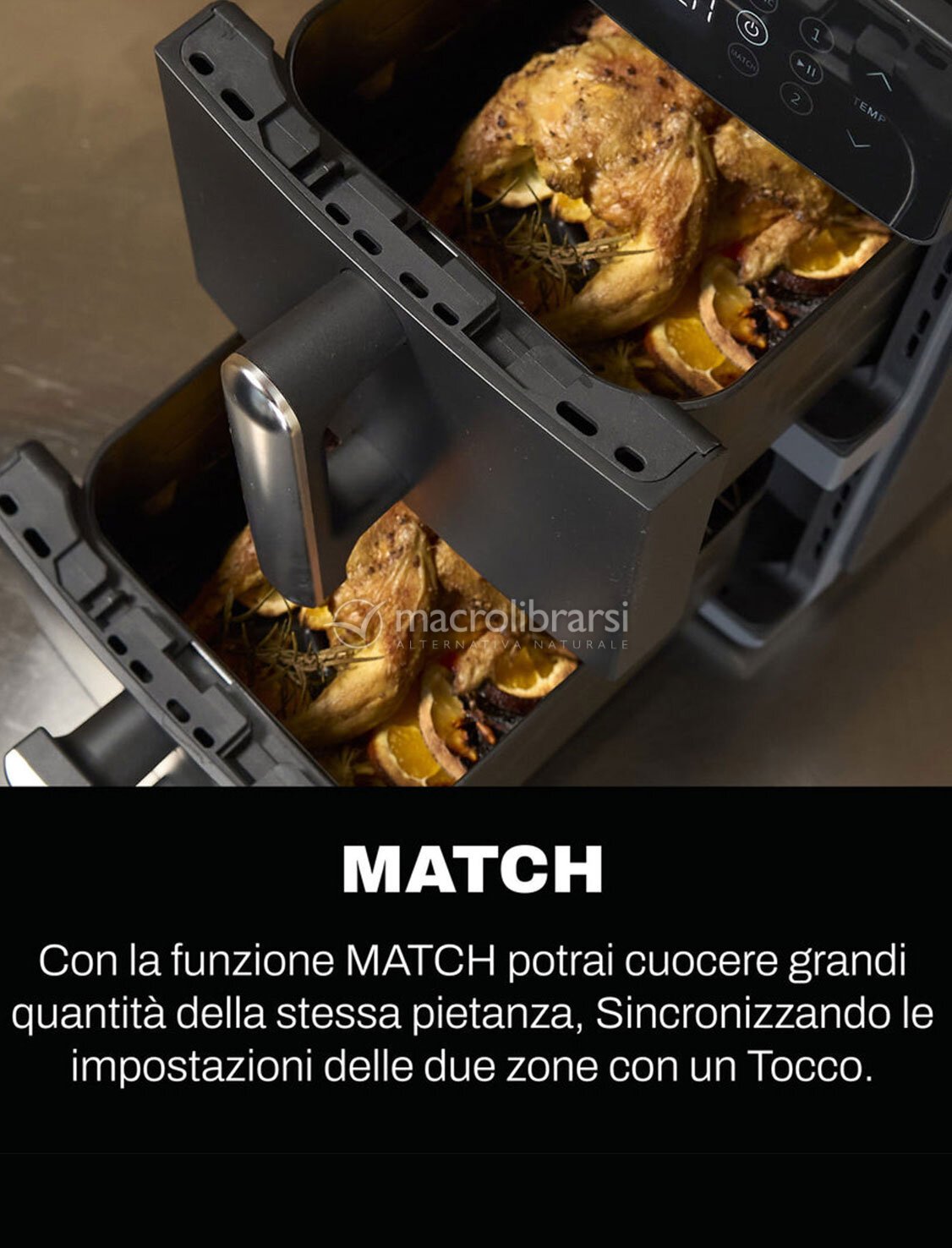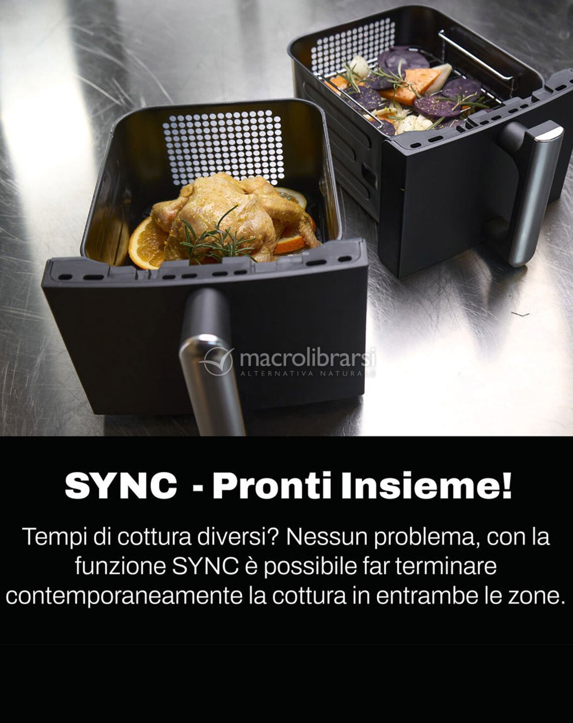 Grazie alla doppia zona di cottura con cassetti indipendenti, puoi preparare contemporaneamente piatti diversi con tempi e temperature separati: perfetta per cuocere insieme secondo e contorno, ottimizzando tempi ed energia.
