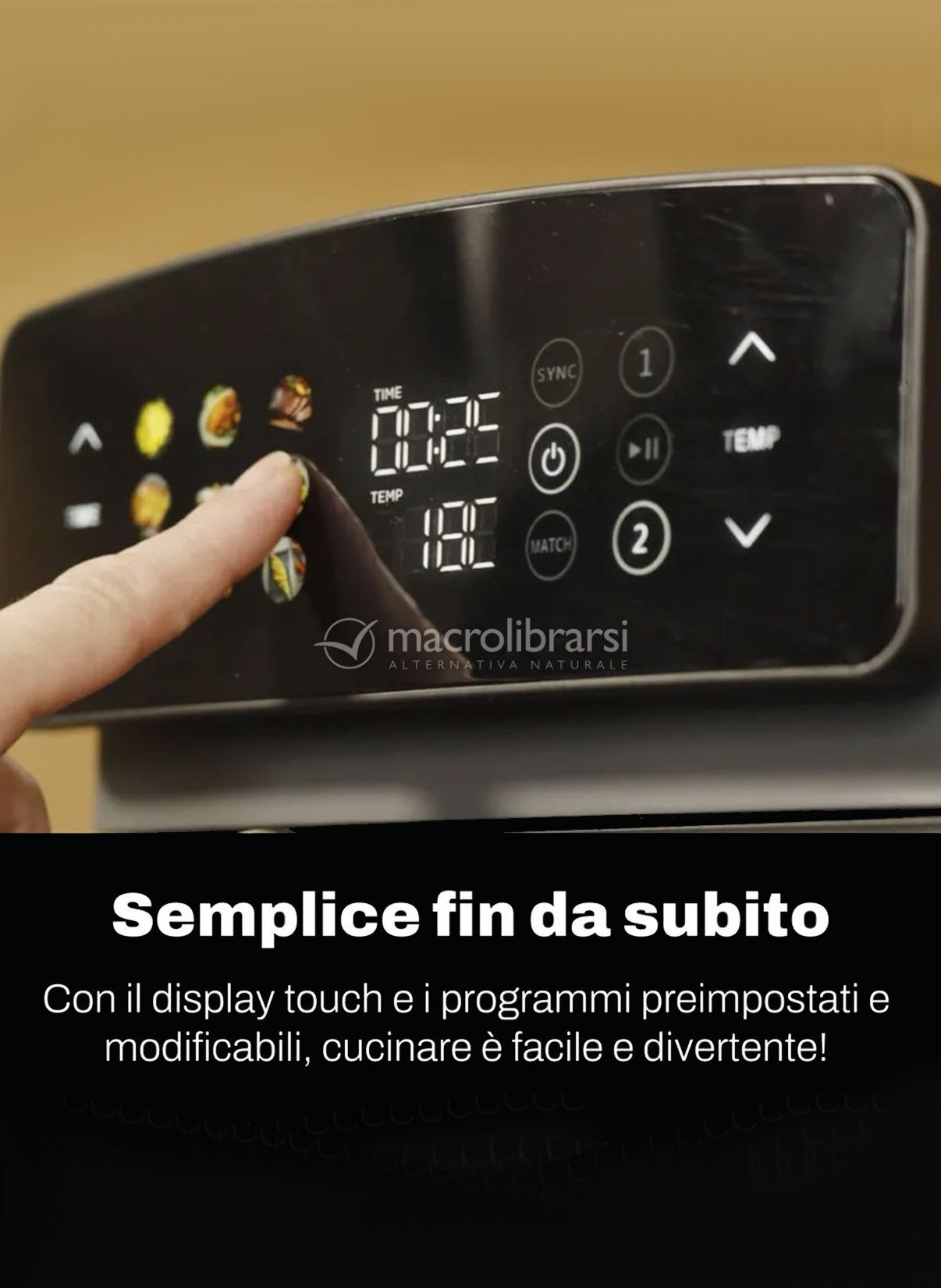 Il pannello digitale touch con display LED rende l’utilizzo semplice e intuitivo: puoi impostare manualmente temperatura e tempo (da 60°C a 220°C) oppure scegliere uno dei 9 programmi automatici dedicati ai piatti più comuni (patatine, carne, pesce, verdure, dolci e altro). È possibile modificare i parametri anche durante la cottura, per adattare in ogni momento la preparazione alle tue esigenze.