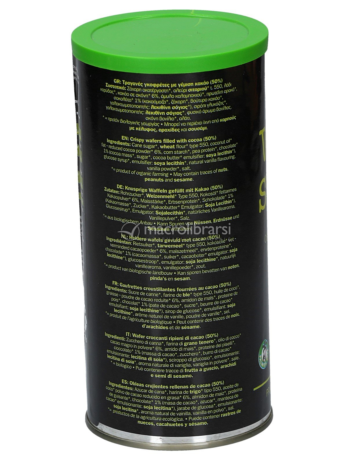 Prodotto dolciario senza olio di palma, vegan e naturalmente senza latte. Una croccante cialda al cacao ripiena di cioccolato (50%).