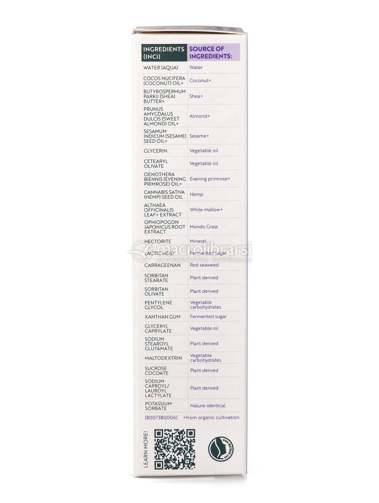 La sua formula ricca e altamente dermocompatibile combina malva bianca biologica, olio di enotera biologico e estratto di radice di erba mondo (Ophiopogon japonicus) per calmare la pelle già dalla prima applicazione, fornendo un’idratazione immediata e duratura fino a 24 ore.