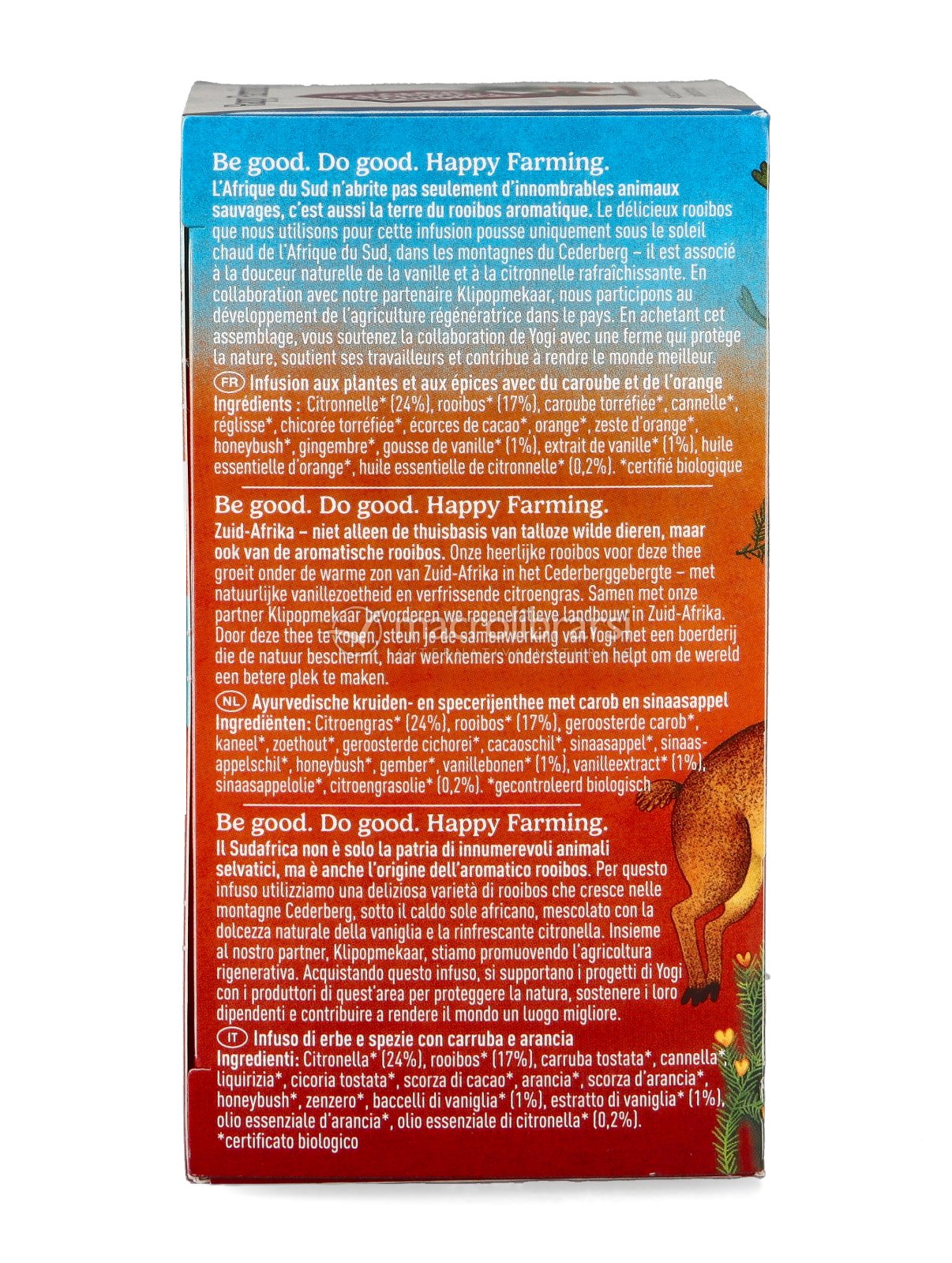 Più di un semplice tè: è una scelta consapevole. Acquistando Happy Farming, rafforzi la partnership di Yogi Tea con Klipopmekaar, un'azienda agricola pioniera nell'agricoltura rigenerativa. Questa pratica non si limita a "non inquinare", ma lavora attivamente per proteggere la natura, arricchire il suolo, sostenere la biodiversità e garantire condizioni di lavoro dignitose per i propri dipendenti. Bevi un tè delizioso e contribuisci a rendere il mondo un posto migliore.
