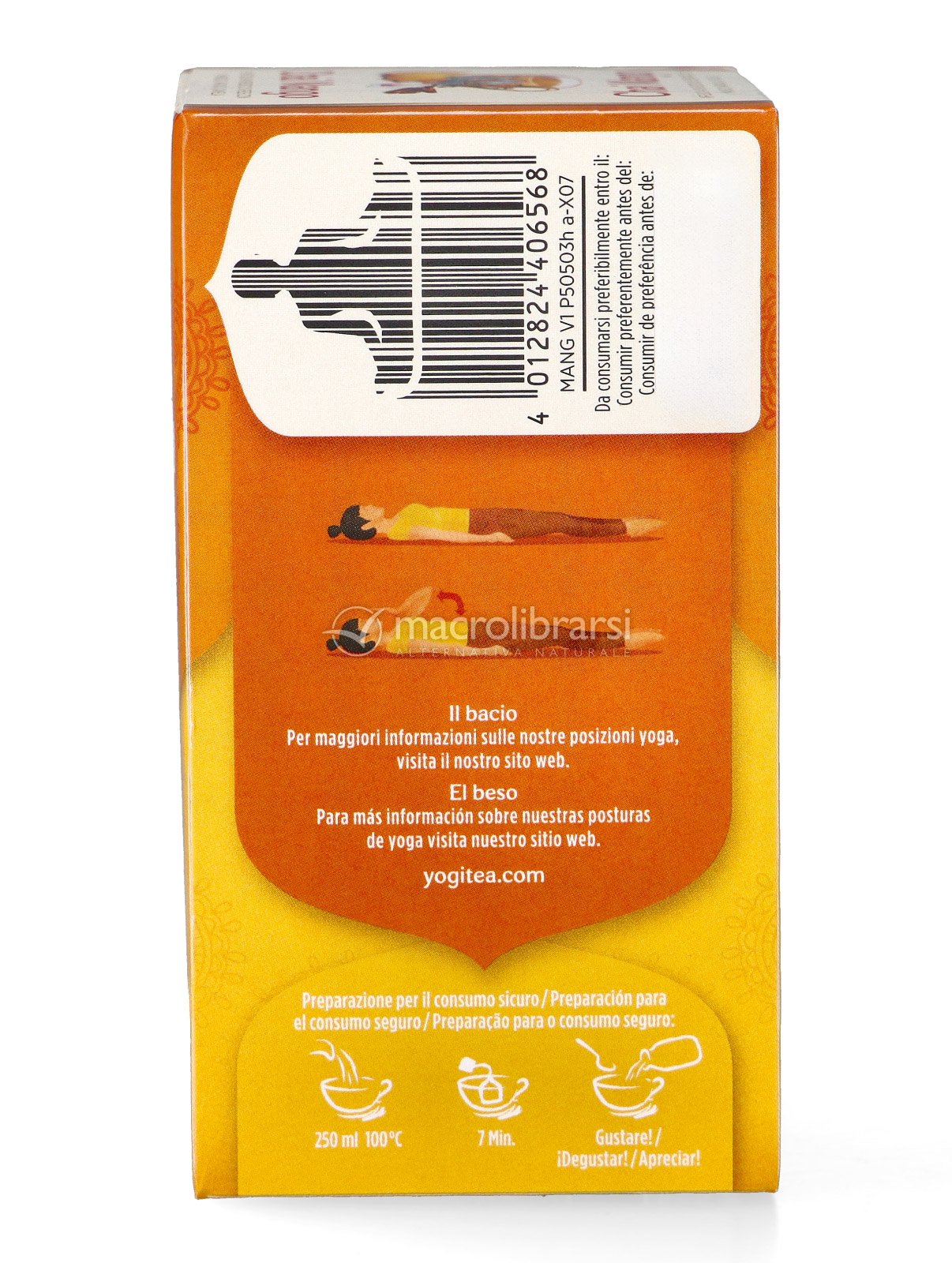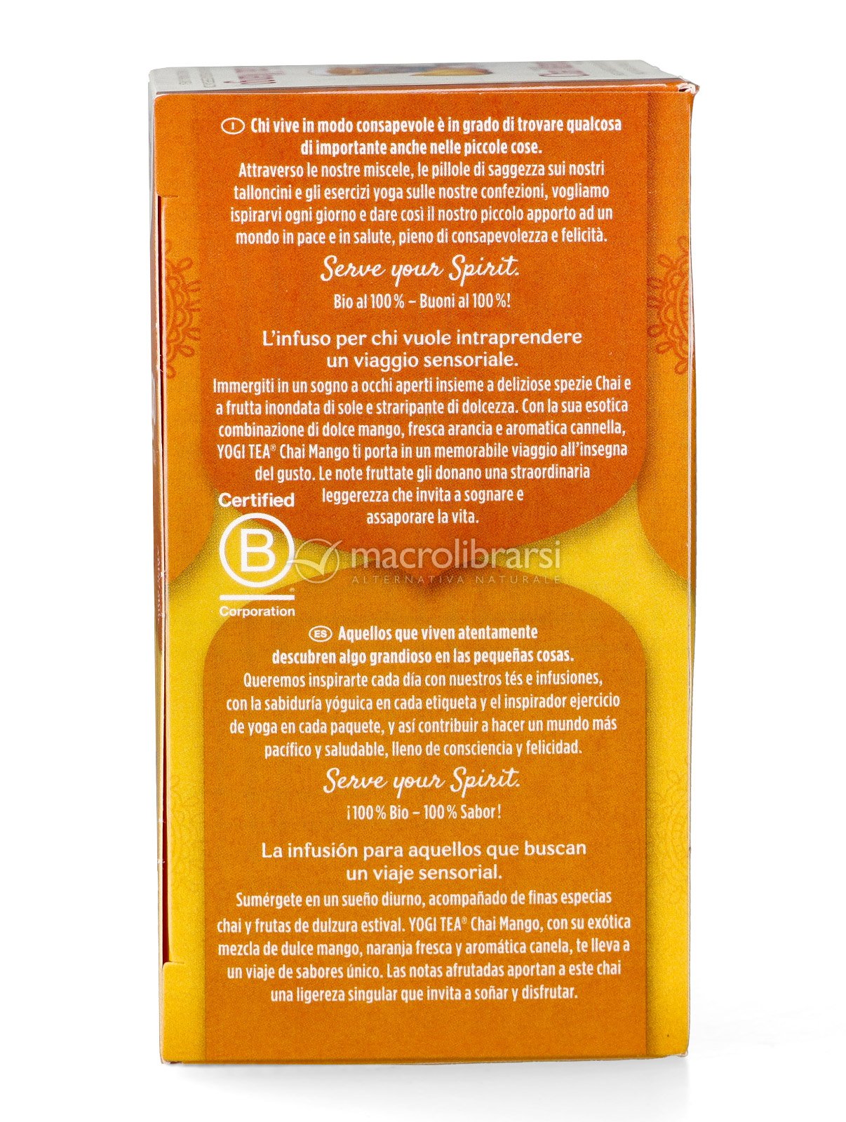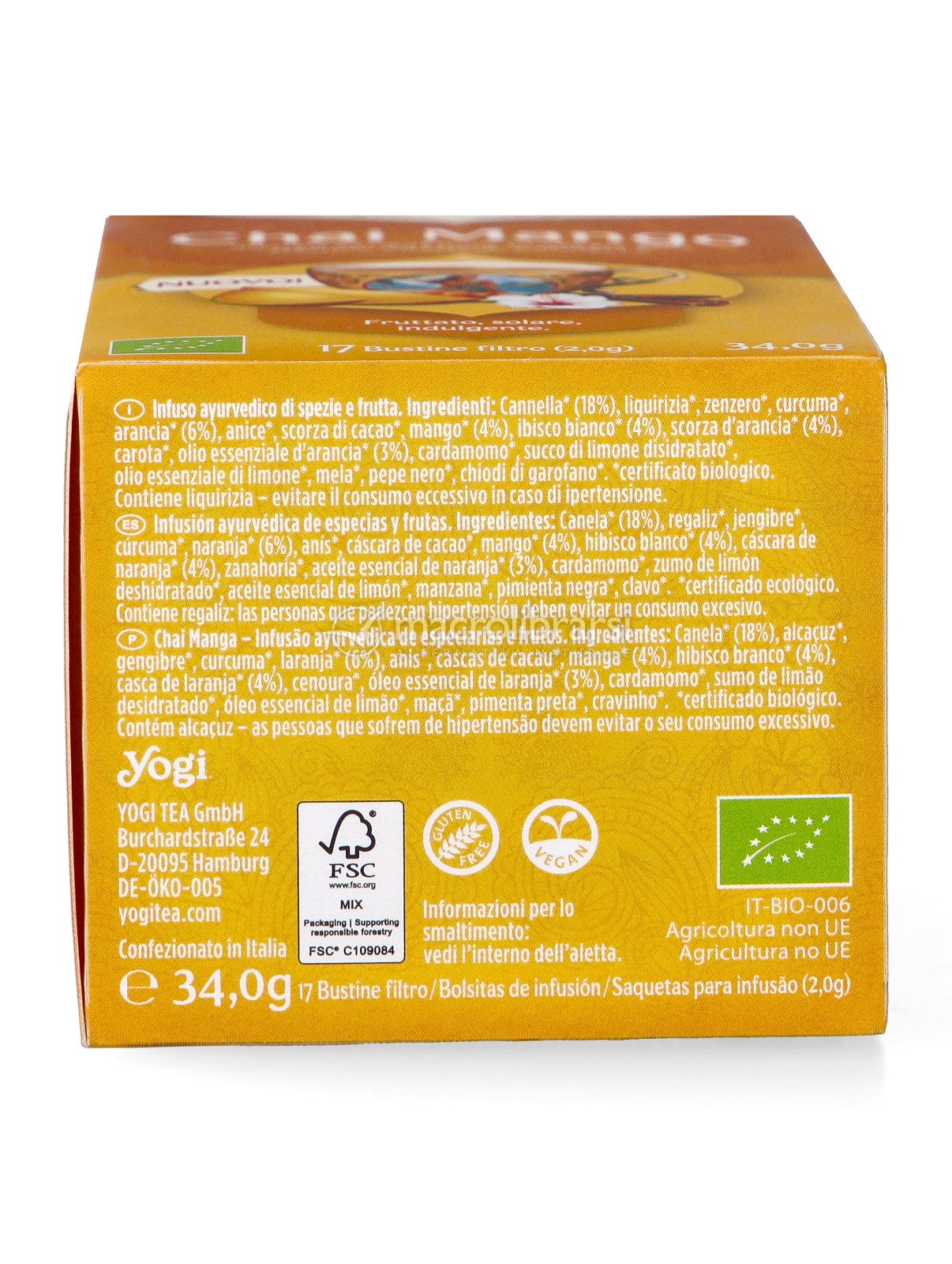 YOGI TEA® Chai Mango è una tisana herbal, senza caffeina, che sorprende con il suo gusto fruttato e rinfrescante. La sua ricetta armoniosa combina cannella, zenzero, curcuma e cardamomo con note solari di mango, arancia e limone, arricchite da delicate sfumature di cacao, mela e carota.