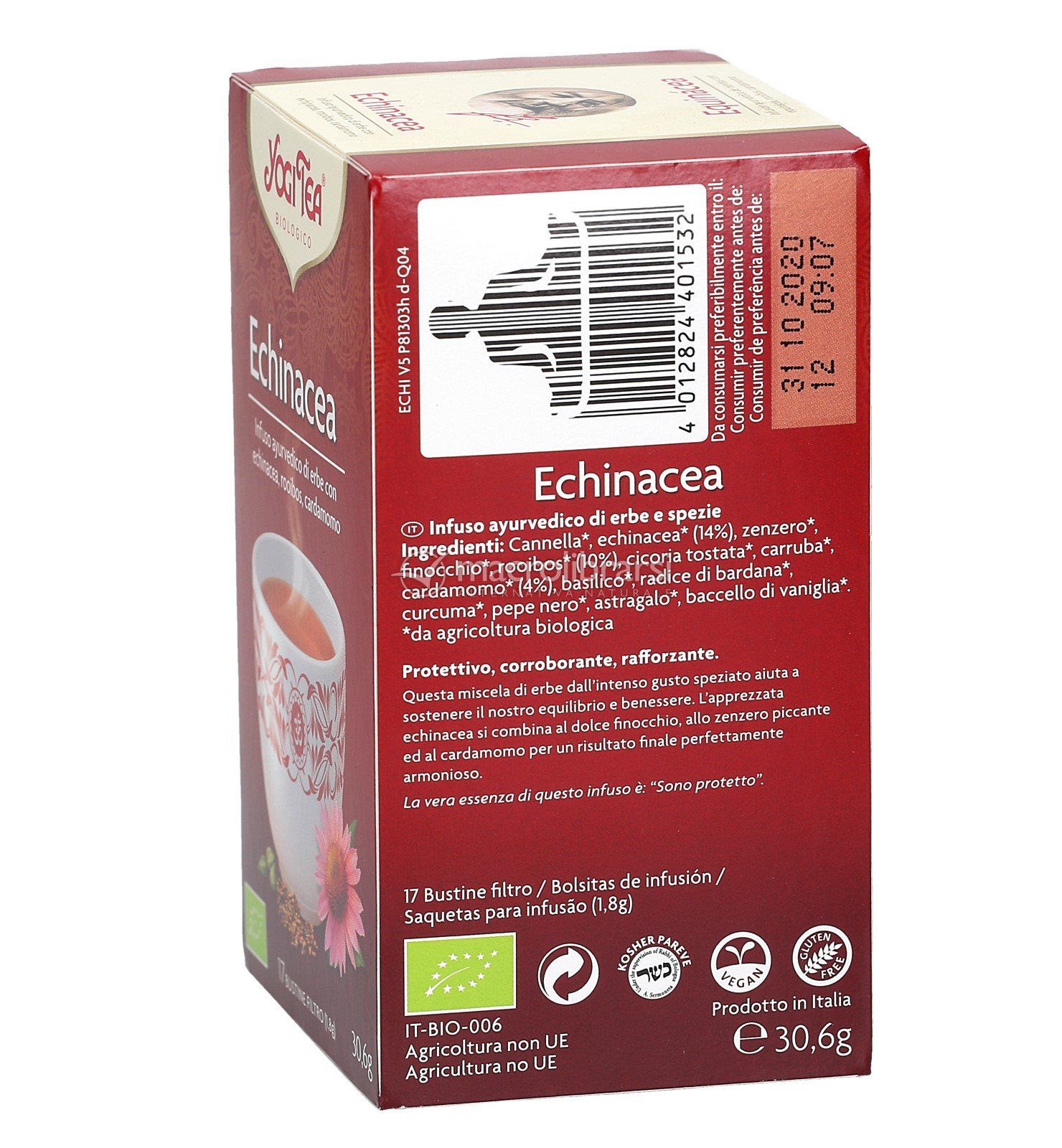 Ho provato tempo fa, per la prima volta, uno Yogi Tea (vox clara) e mi è subito piaciuta la nota leggermente speziata e il suo sapore che mi ricorda l’India… e anche questa miscela con echinacea mi dà le stesse sensazioni pur avendo sfumature diverse rispetto a voz clara. Davvero ottimi questi infusi.