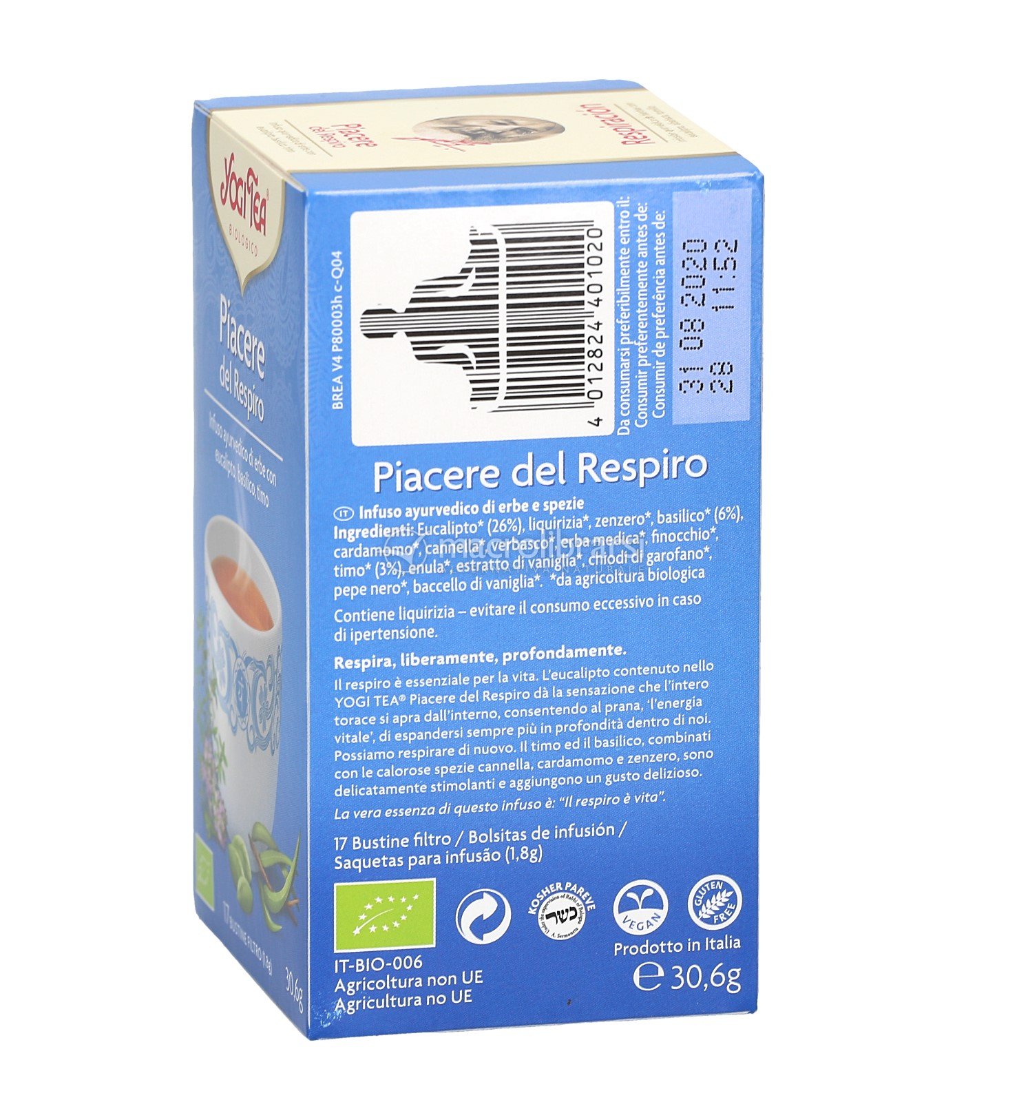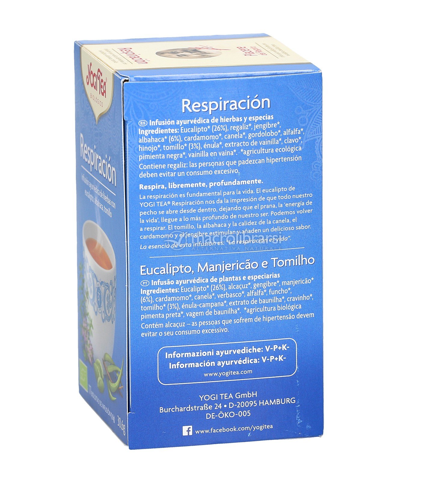 Una respirazione consapevole, soprattutto dei respiri lunghi, profondi e rilassati, costituisce uno dei modi più semplici per aumentare la propria energia, o Prana, e per sentirsi più tranquilli e più equilibrati. Il tè Respiration è una tradizionale miscela ayurvedica di eucalipto, enula, basilico, zenzero, radice di liquirizia e altre erbe secondarie.