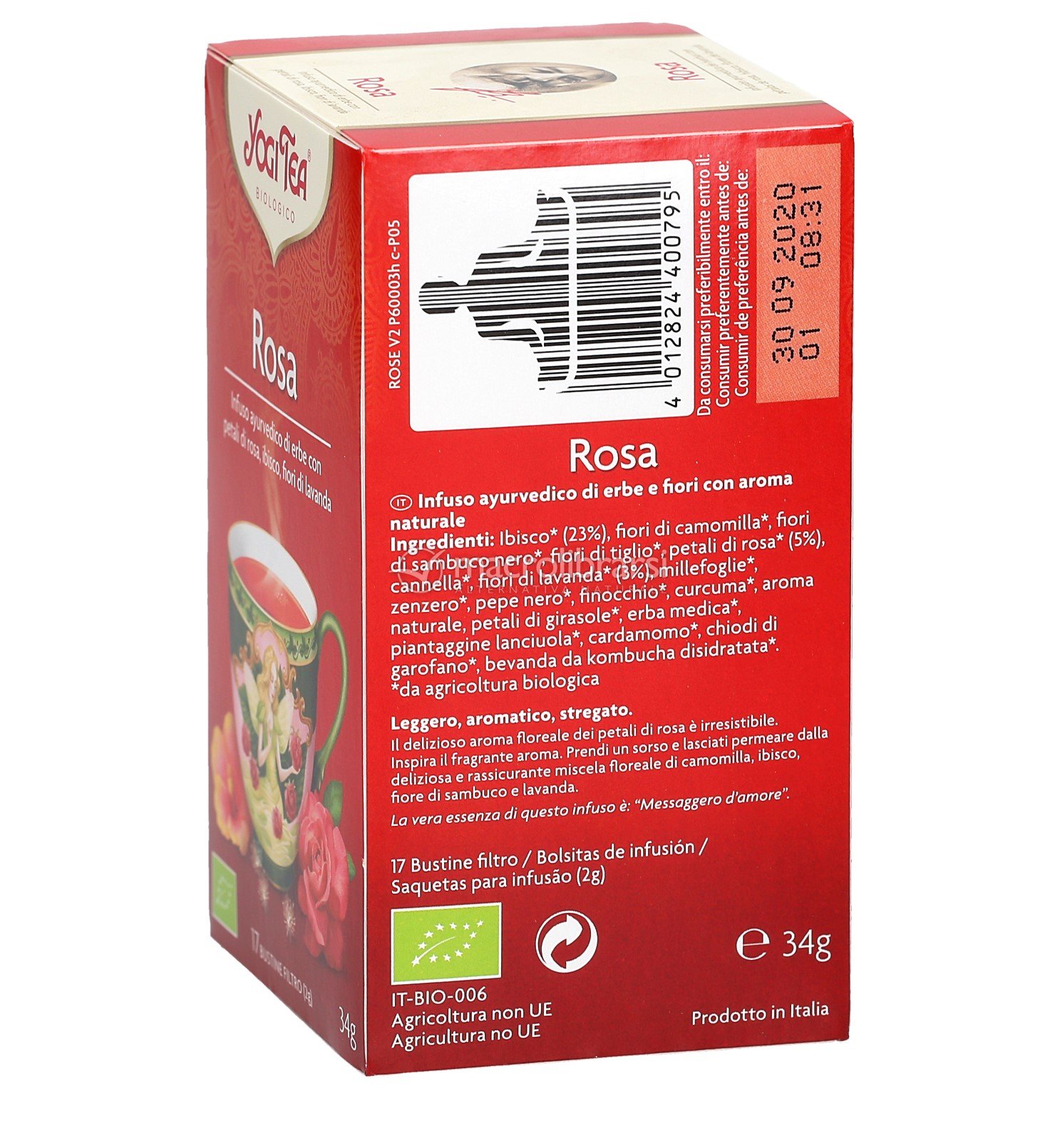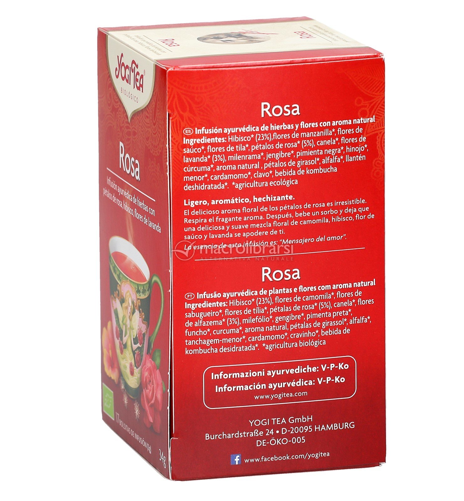 Questo yogi tea alla rosa è un infuso dal gusto molto piacevole e dal profumo intenso è ideale per momenti di gioiosi relax.