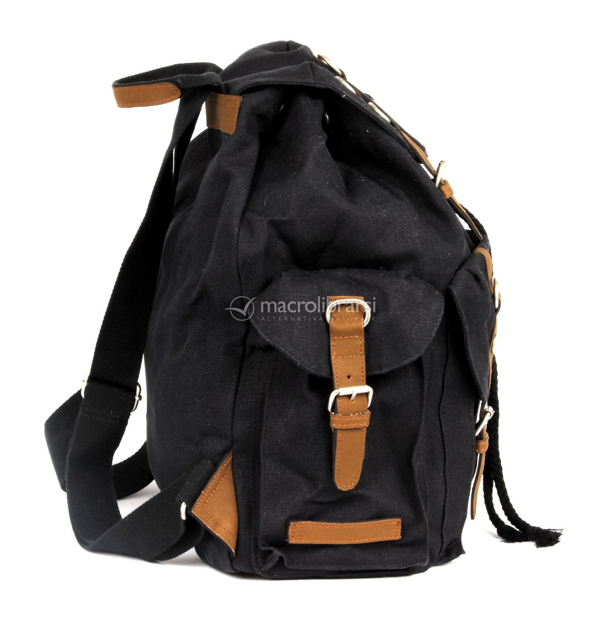 Lo zaino HF016 nero in canapa e cotone unisce stile classico e massima praticità, con tante tasche e una chiusura sicura perfetta per l’uso quotidiano.