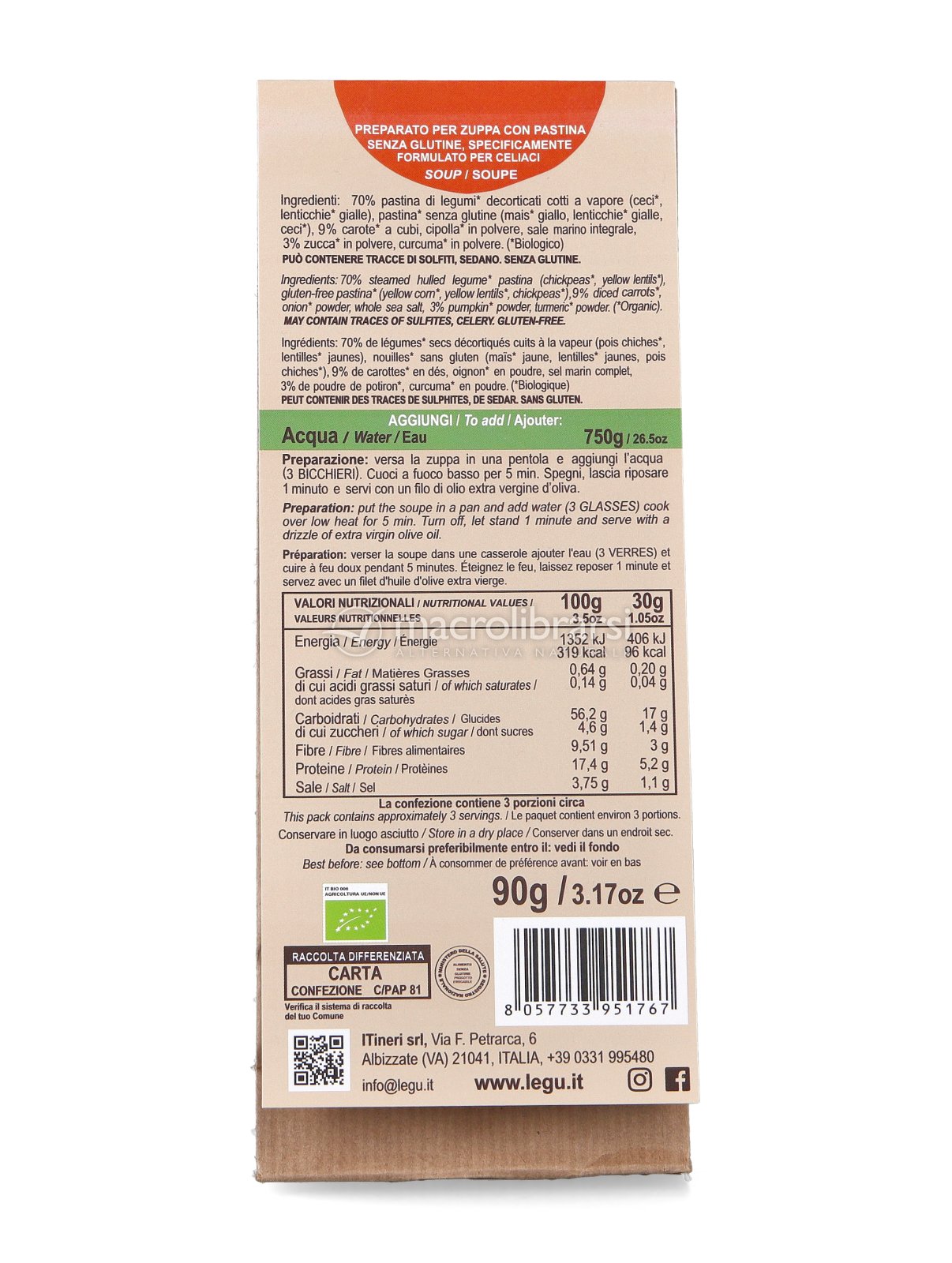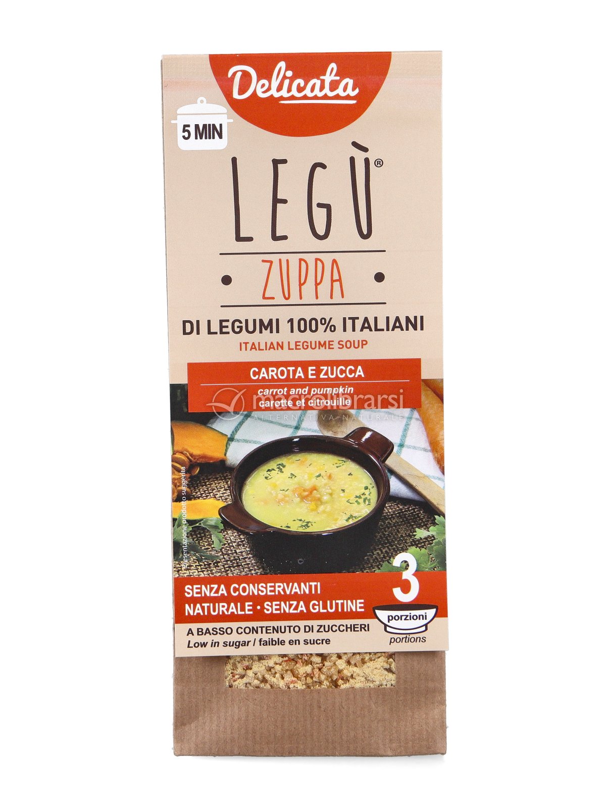 Con legumi, zucca e carote, la zuppa di LEGÙ è preparata con soli ingredienti italiani e biologici.