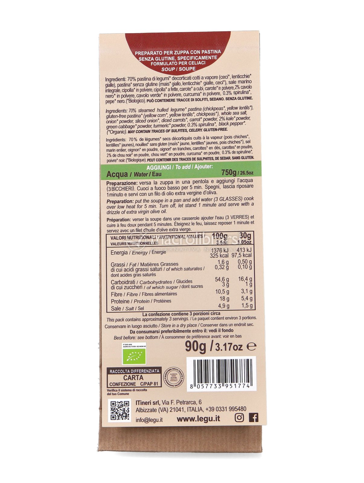 70% legumi* cotti a vapore (in proporzione variabile tra ceci*, lenticchie* gialle decorticate), cereali* cotti a vapore (mais* giallo, lenticchie* gialle, ceci*, mais* bianco, miglio*), cipolla*, carote*, sale marino integrale, 4% cavolo* nero, curcuma*, pepe*, 0.3% spirulina*. SENZA GLUTINE (*Biologico)