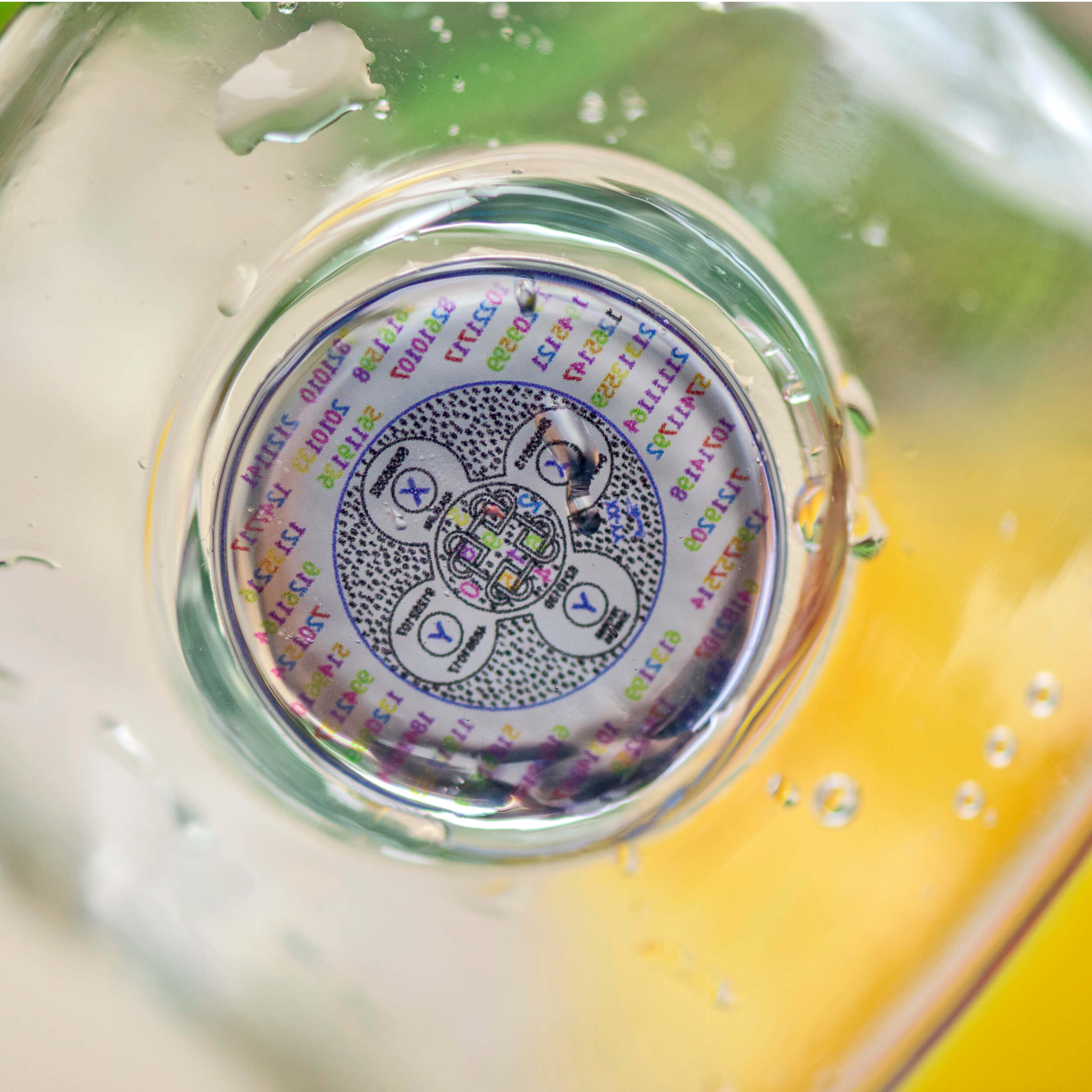 Il cuore della i9bottle è un adesivo (sticker) ricoperto di gel siliconico ideato dall’ing. Vili Poznik e con impresse oltre 10.000 informazioni benefiche.