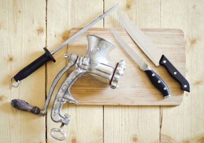 - Tritacarne per macinare o tritare la carne. Con alcuni di essi si possono anche tritare le ossa. In genere ne basta uno da azionare a mano. Per chi, però, desidera preparare grandi quantità di carne tritata, sarebbe forse indicato procurarsi un attrezzo elettrico. Bisognerebbe anche avere a disposizione diversi dischi con fori di dimensioni differenti, con i quali si può tritare la carne in spessori diversi.