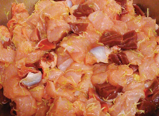 Una volta preparate, si possono mischiare tutte le componenti animali del pasto in una ciotola.