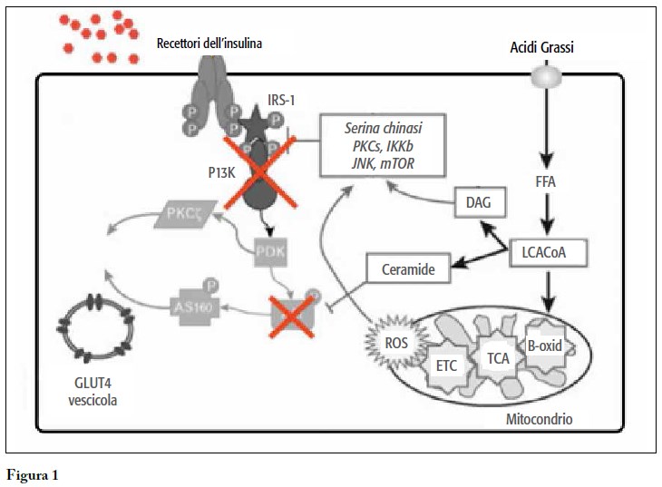 I puntini rossi in alto sono il glucosio, i triangolini gialli l’insulina. Il metabolismo dei grassi liberi nel sangue (FFA: Free Fatty Acids) produce radicali liberi (ROS) che inibiscono l’azione di alcuni enzimi fondamentali per l’apertura della vescicola GLUT4, deputata al trasporto del glucosio all’interno della cellula (Figura 1).