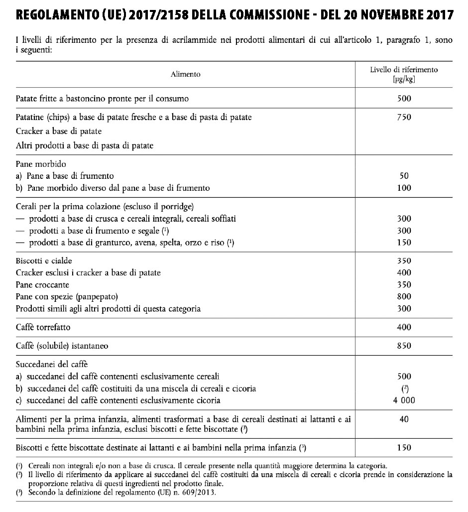 Un dettaglio, che vi invito a scoprire leggendo il Reg 2158, è questo: «Gli Osa [operatori del settore alimentare; N.d.R.] sostituiscono gli ingredienti che potenzialmente fanno aumentare i tenori di acrilammide nel prodotto finale se ciò è compatibile con la sua progettazione e con le possibilità tecniche; questo riguarda ad esempio l’uso di noci e semi torrefatti a temperature basse piuttosto che elevate». Ciò significa, in pratica, che l’operatore del settore alimentare può soprassedere dal seguire le indicazioni della Norma, qualora la sua ricetta preveda ingredienti non sostituibili oppure in assenza di strumenti di lavorazione adeguati a mantenere bassi i livelli.