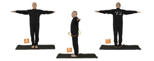 In piedi (A), braccia larghe, palme rivolte verso il basso, ruotare su se stessi in senso orario (B), in modo che il braccio sinistro ruoti verso destra (C).