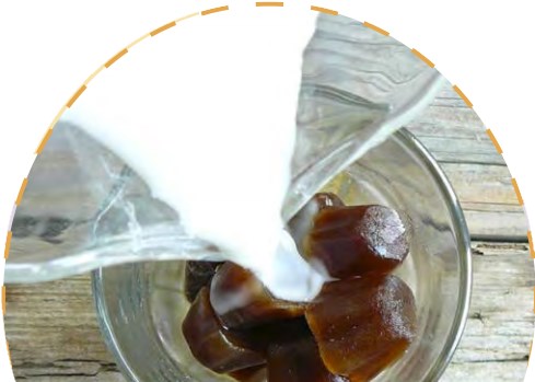 Mescolare lo sciroppo di latte di mandorle con l’acqua, versarlo in appositi stampi per il ghiaccio e mettere tutto in freezer.