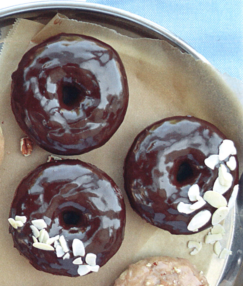 1. Preparate le ciambelline: preriscaldate il forno a 175°C. Spennellate di olio una teglia per 6 ciambelle e tenetela da parte. Setacciate in una scodella la farina, il cacao e il lievito. Aggiungete lo zucchero e il sale e mescolate bene con una frusta, poi tenete da parte. In un'altra scodella mescolate con una frusta lo yogurt, l'aquafaba, la bevanda vegetale, il burro e la vaniglia. Versate il composto a base di farina c lavoratelo velocemente con una spatola, per amalgamarlo appena; è normale che-si formino grumi, otterrete una pastella densa.