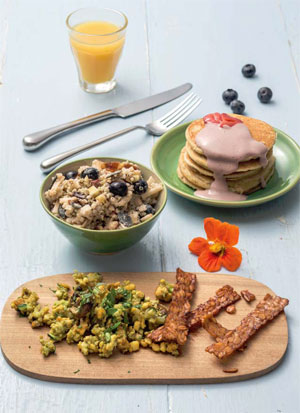 Per preparare i pancake in una ciotola mescola la farina con gli altri ingredienti secchi. Aggiungi l’olio, il latte di mandorla e di riso e lascia riposare l’impasto per breve tempo.