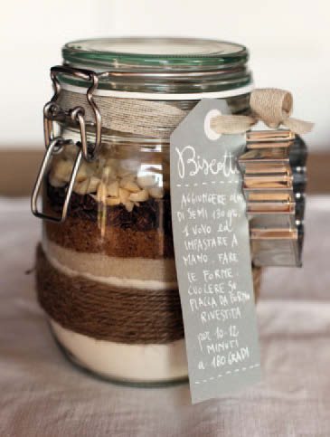 Possono essere pensieri molto semplici: marmellate e confetture, verdure sott’olio, croccanti, biscotti e torte. Per i più frettolosi c’è una soluzione ancora più originale e divertente: una ricetta in barattolo!