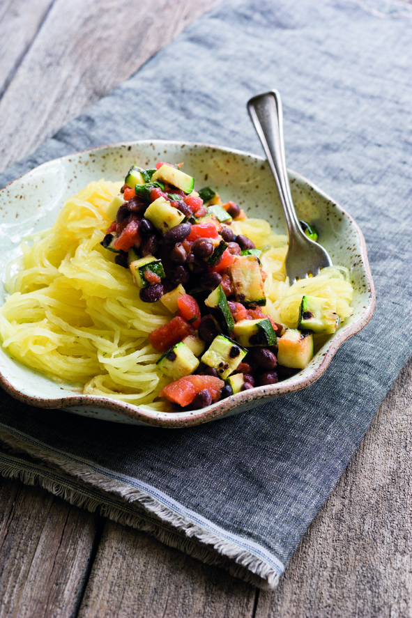 Zucca Spaghetti arrosto con pomodori, fagioli neri e zucchine