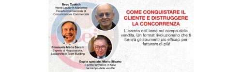 Te lo spiegano grandi relatori come Beau Toskich, Emanuele Maria Sacchi, e Mario Silvano: seguendo i loro consigli conquisterai la fiducia dei tuoi clienti e diventerai il leader del mercato.