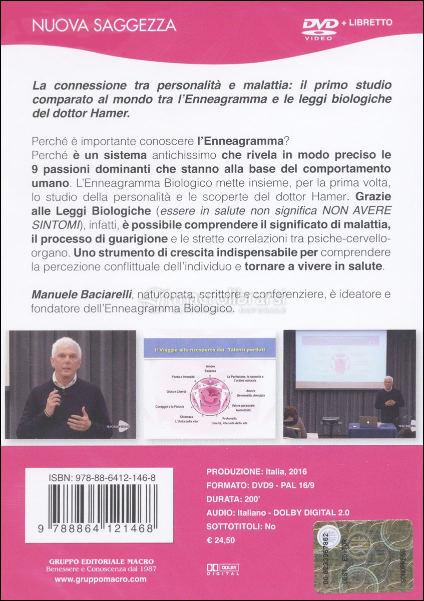 L’Enneagramma Biologico, mette insieme lo studio della personalità secondo il modello dell’enneagramma e le scoperte del dr. Hamer. Comprenderai che esiste una corrispondenza, soprattutto per le situazioni recidivanti (recidive conflittuali, conflitti in sospeso), una predisposizione per ciascuna delle tipologie dell’enneagramma a sviluppare certi sintomi psichici e organici... e che questi, grazie alle scoperte di Hamer, hanno un senso. Grazie alle Leggi Biologiche (essere in salute non significa NON AVERE SINTOMI) comprenderai il significato di malattia, il processo di guarigione e le strette correlazioni tra psiche-cervello-organo. Il tuo corpo non fa nulla di sbagliato.